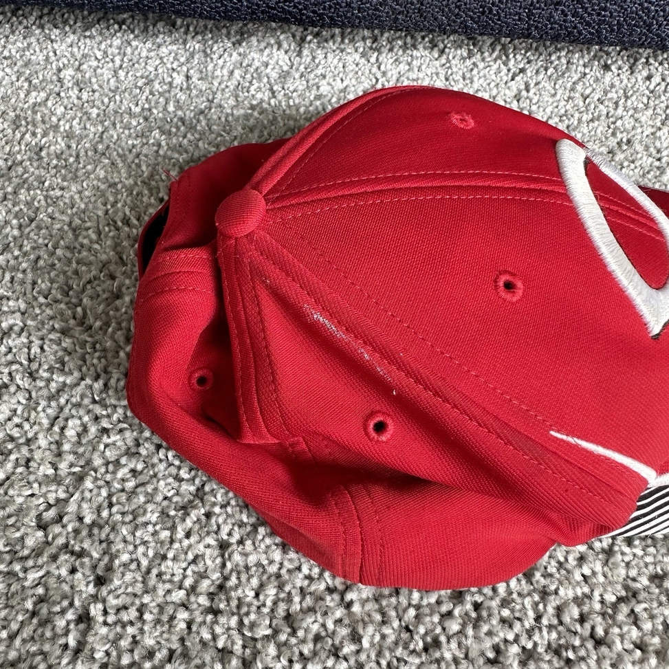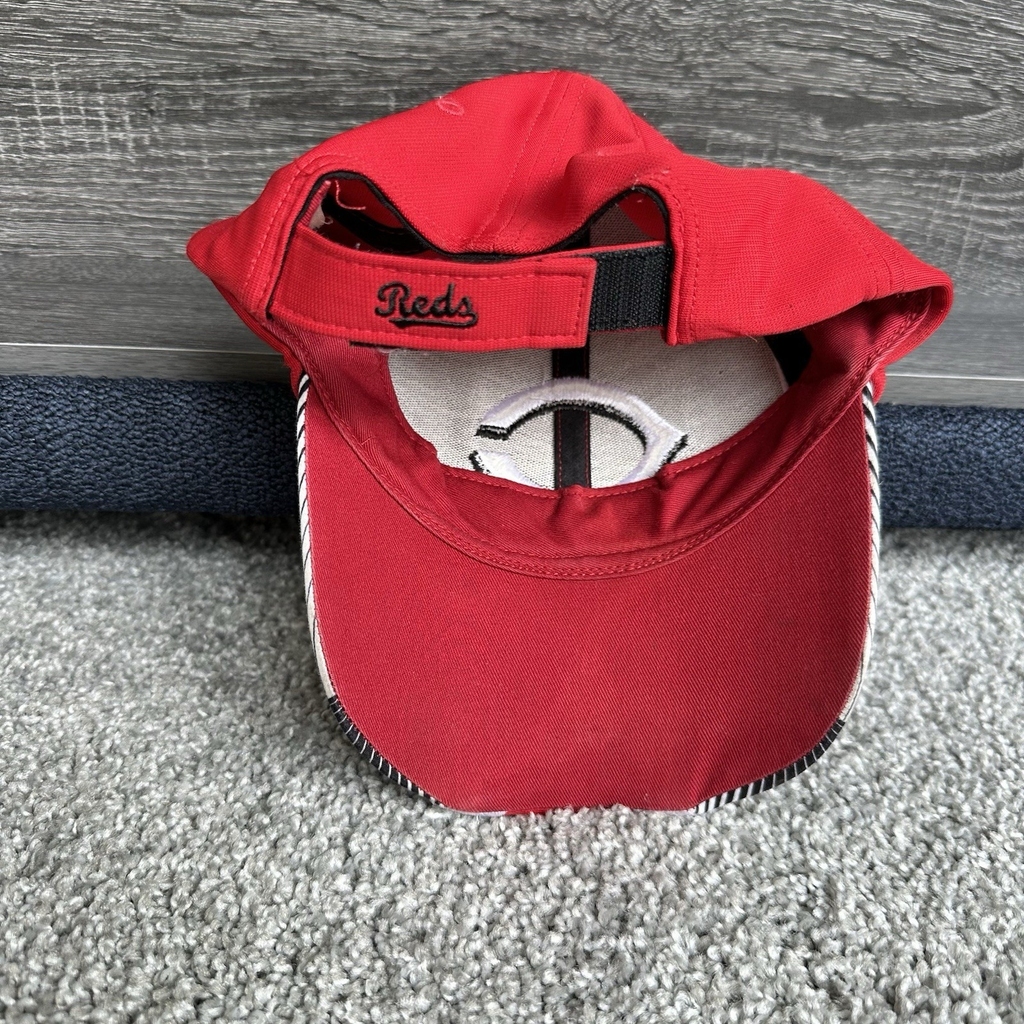 The product is a vintage Cincinnati Reds '47 Brand red hat that features the team's name "REDS" and the letter "C" stitched on it. This baseball hat is adjustable for a comfortable fit and is a must-have accessory for fans of the Cincinnati Reds. Made by Stitches in the Major League Baseball league, this hat showcases the team's colors and logo, making it a perfect addition to any fan's collection. Perfect for showing support for the Reds during baseball games or casual outings.