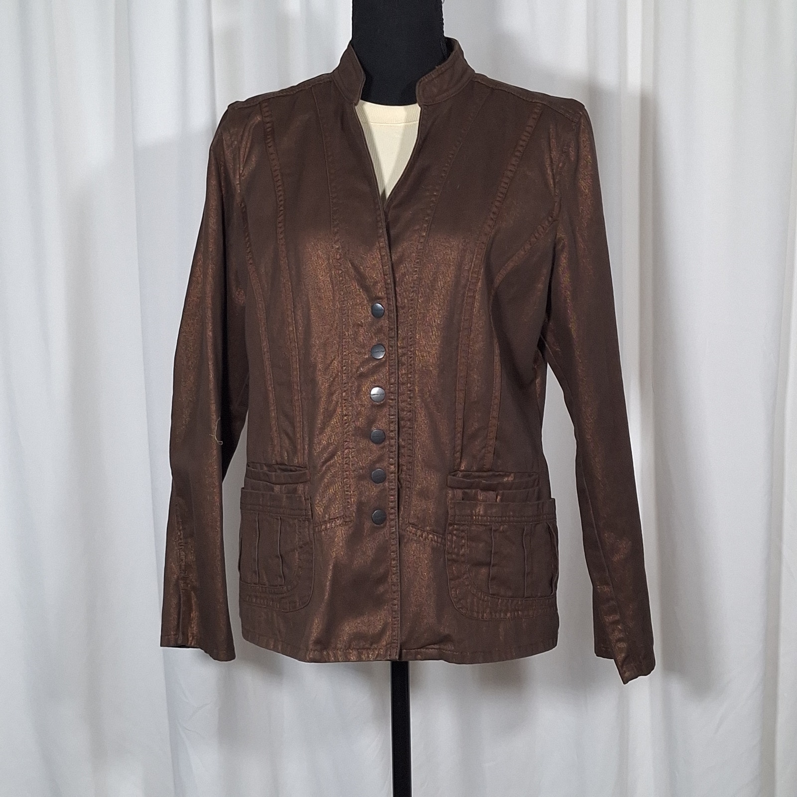 Coldwater Creek size 12 bronze-brown shimmer jacket with snap buttons, pockets, and sleek tailoring--perfect for fall outfits, workwear, or going-out layers. It's giving "quiet luxury... but with sparkle."