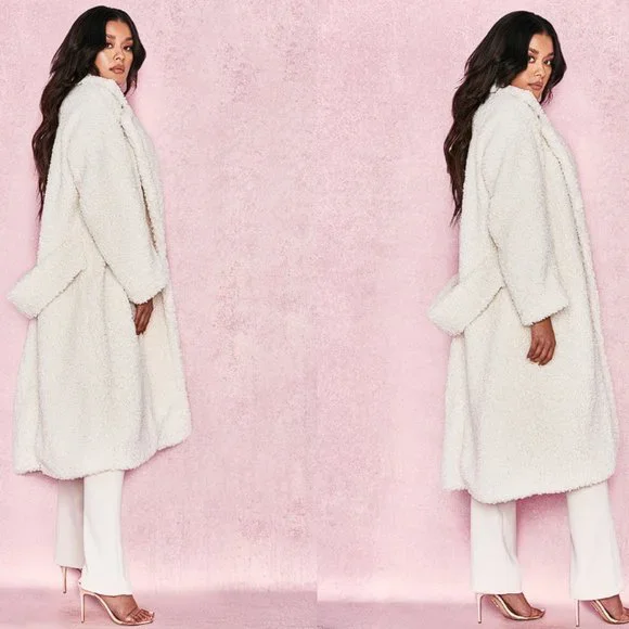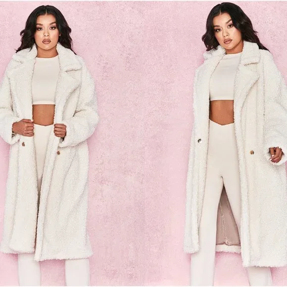 The sold out gem is THE coat you've all been waiting for is here. Crafted from a soft and luxurious faux fur, 'Bear' has an oversized relaxed fit, long sleeves and half belt. You'll love this teamed over all white for a super glamorous monochrome look. Made from faux fur. Length: Approx 110cmMaterials: Sherpa Faux (100% Polyester) Lining (100% Polyester)Gentle Dry Clean Only Model is 5 ft 7 and wears size XSThis coat is brand new, the inside tag has been cut in half