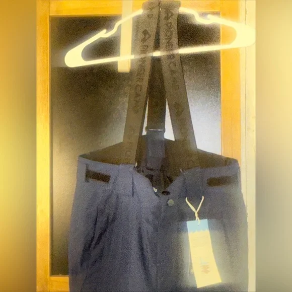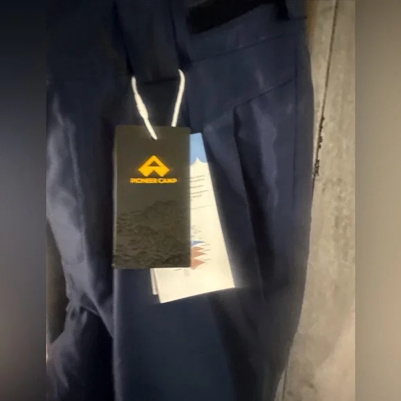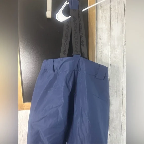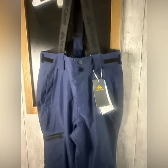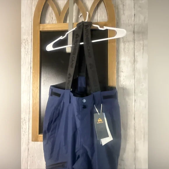 The NWT Pioneer Camp Men's Snow Pants Ski Bibs are designed for winter sports enthusiasts who enjoy skiing and snowboarding. These waterproof insulated snowsuit overalls come in a classic navy blue color with a solid pattern, featuring long sleeves and a zip closure. Made of polyester outer shell material and insulated with polyester, these snow pants are machine washable and perfect for casual occasions during the winter season. The zipper accents add a stylish touch to this functional and durable ski bib designed for outdoor adventures.