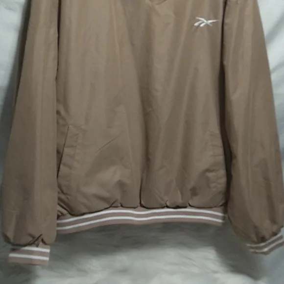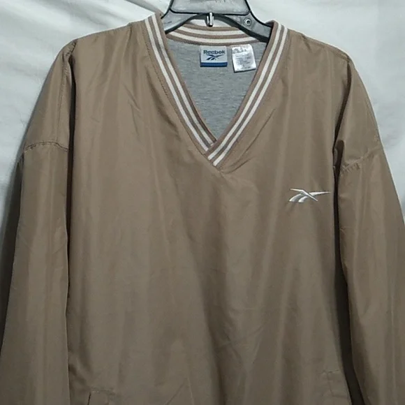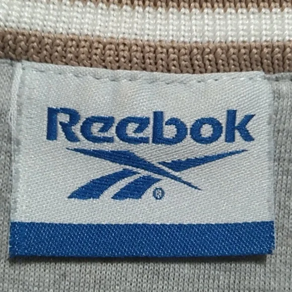Hard To Find, Hardly worn vintage Reebok pullover!! In very good condition! Size large! Has 2 front pockets!Measurements Laying Flat:Pit to pit: 28".Length: 28 1/2".Sleeve Length: 24 1/2".Smoke And Pet Free Home! Reasonable Offers Always Welcome!What makes this RARE to me is I can find the blue and black like this detail but not the tan amd white, v neck, with stripes around neck and down around the bottom trim. Everything is priced for bids nad offers so please feel free to make your very best offer on anything you like and i never get offended, only accept or counter my lowest