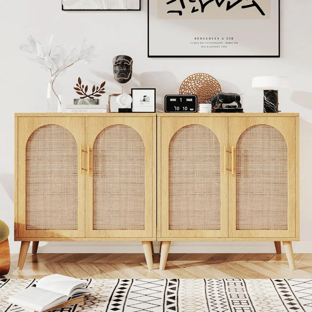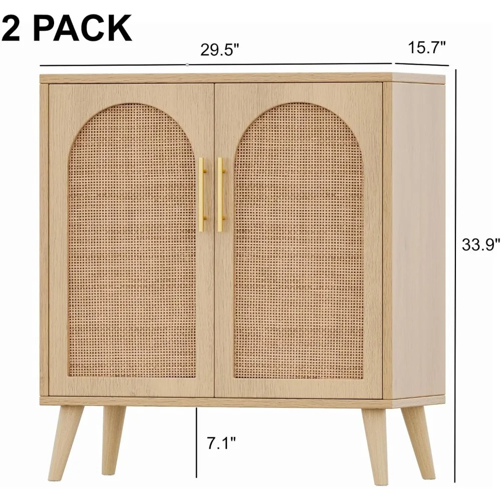 Set of 2 Rattan Storage Cabinet with Doors, Accent Bathroom Floor Cabinet, Modern Sideboard Buffet Cabinet for Living