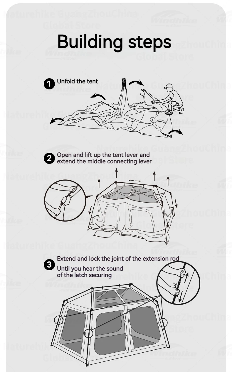 Tent List: Storage Bag x1; Internal Tent x1; External Tent x1; Ground Nails x20; Extend The Canopy x1; 1.7m Hall Pole x4; Wind Ropes x8