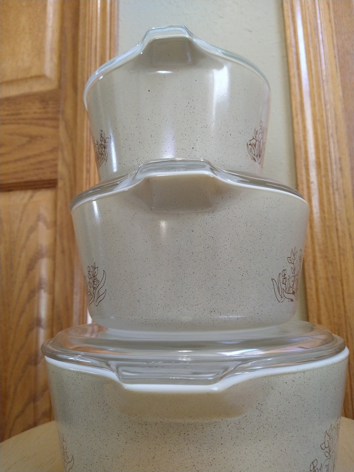 Vintage Pyrex Forest Fancies Mushroom Casserole Dish 473, 474, 475 With Lids in excellent used condition. They look like they have never been used. They have no chips, cracks, DWD, or utensil marks. There are very few flea bites that are only seen when exposed to light. The lids have very few light scratches. They have no chips. See pictures as they are part of the description.