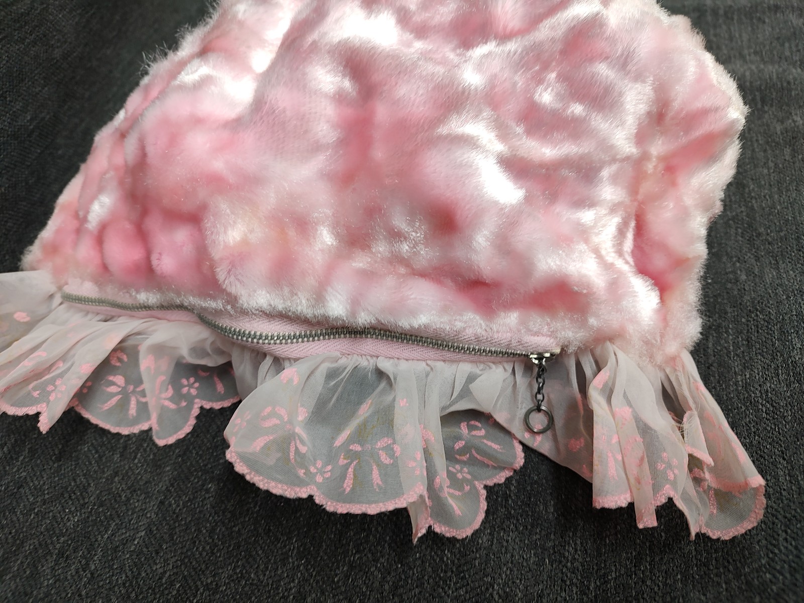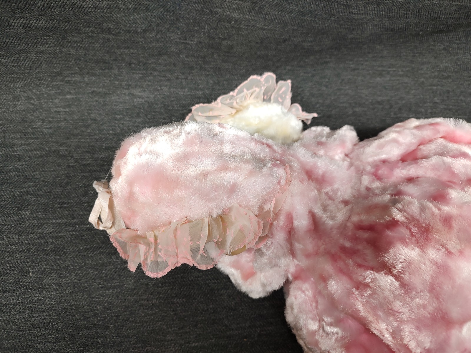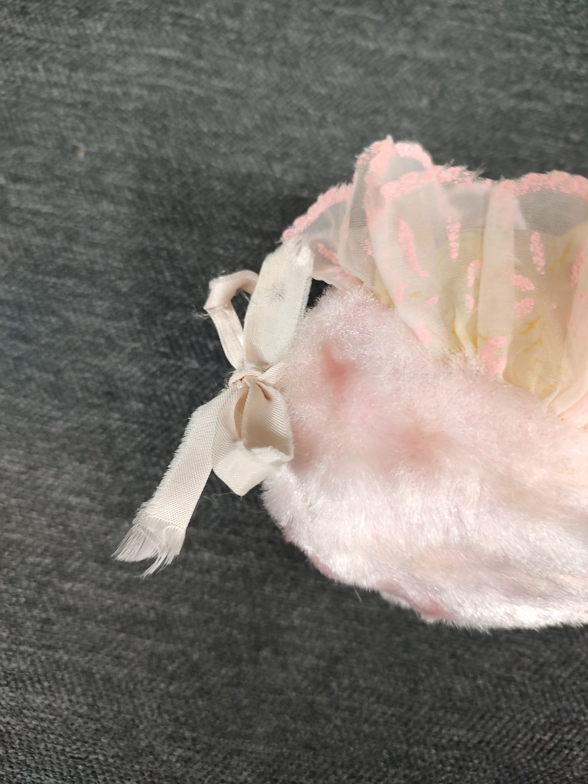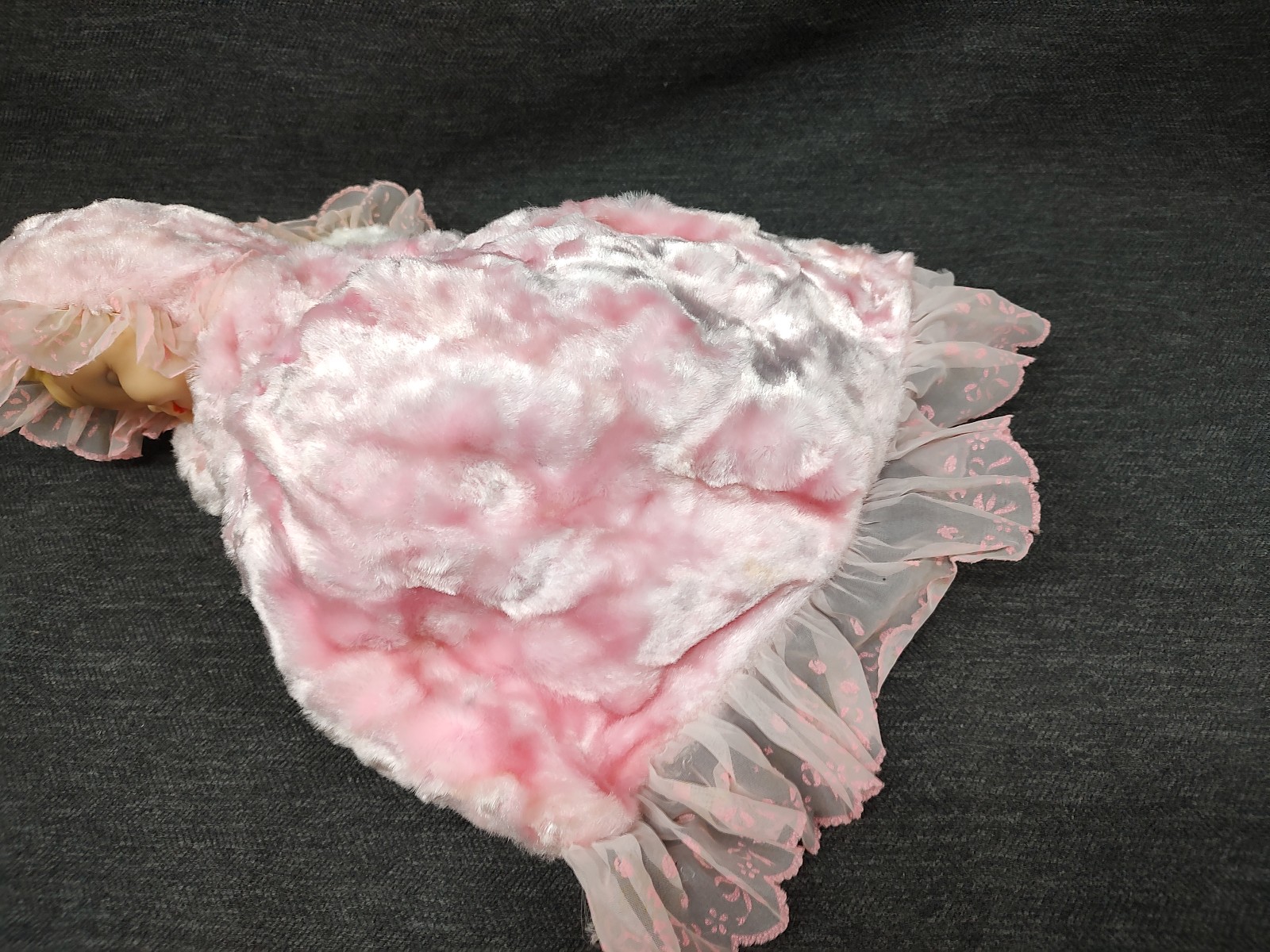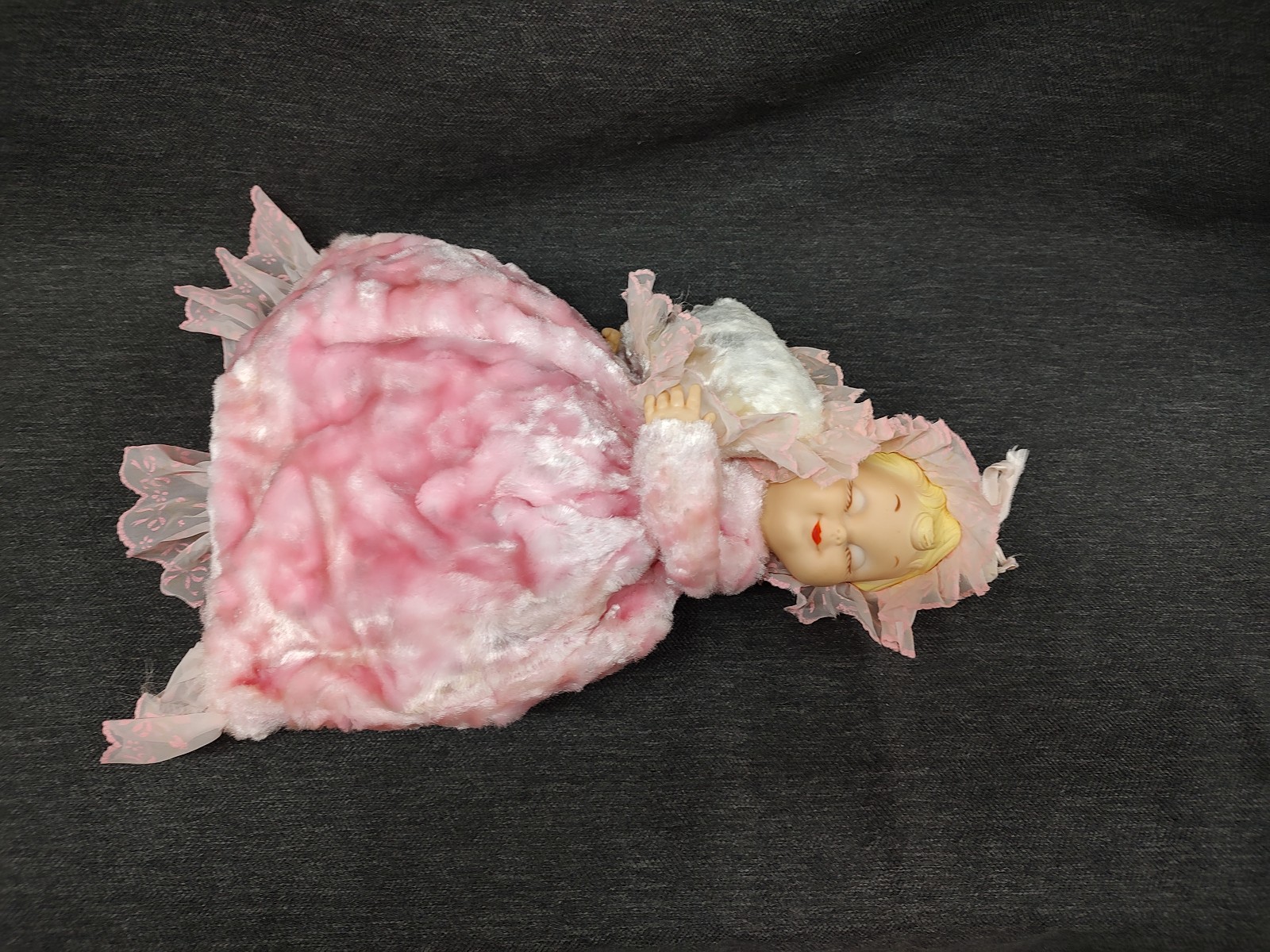 Good condition for age. Ribbons, lace, flowers etc have discoloration and fraying. Zipper is functional. Face paint is in good shape. Fabric has some light discoloration. Please view the photos for the EXACT item you will be receiving.