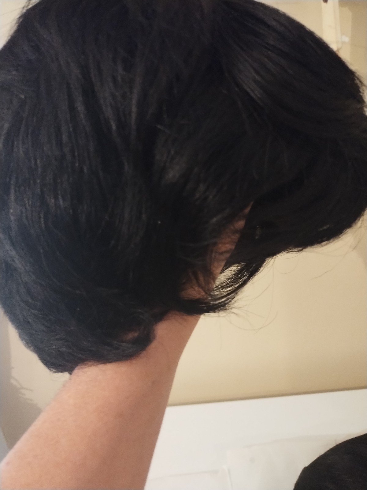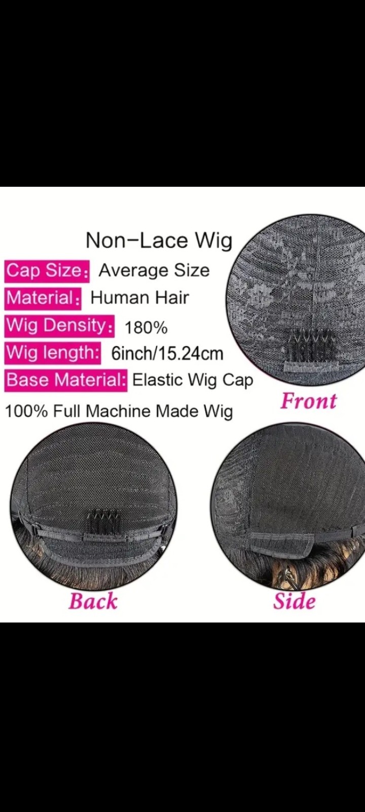NEW wig short 6" Pixie style with bangs. Straight layered, 180% density. Front and back clip with adjustable elastic band. Machine made.