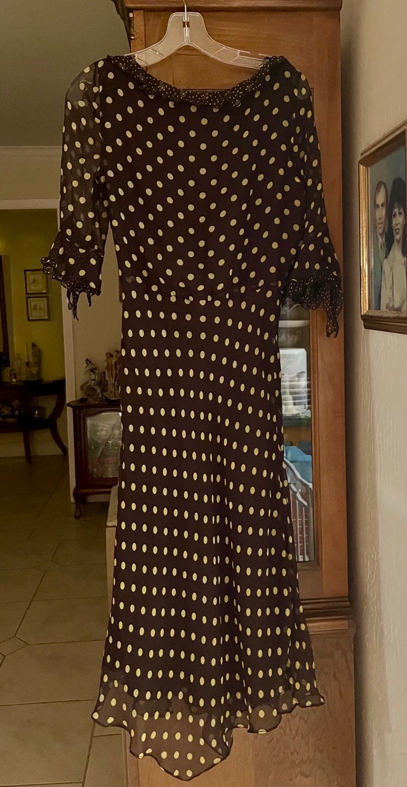 It’s a dark brown solid print with a combination of lime polka dots on most of the dress. The neckline is “v” neckline surrounded with ruffled neckline in brown and small polka dots that’s not overly done. The sleeves are approximately 3/4 length trimmed with like fabric. The body of the dress is flowing and comes with a slight flair with the sides being slightly shorter than the front and back of the hemline. It’s a beautiful dress with a lot of flair great for daywear to dinner.