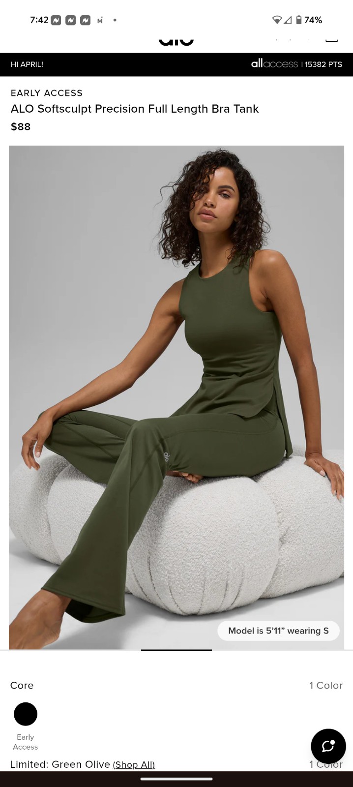 Alo's Softsculpt Precision Full Length Bra Tank, Green Olive in color, size small, worn once! Perfect to wear with shorts or leggings! Rich Fall color