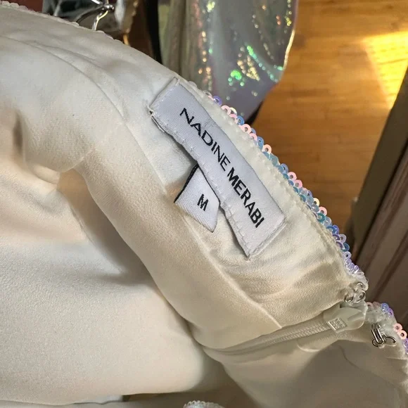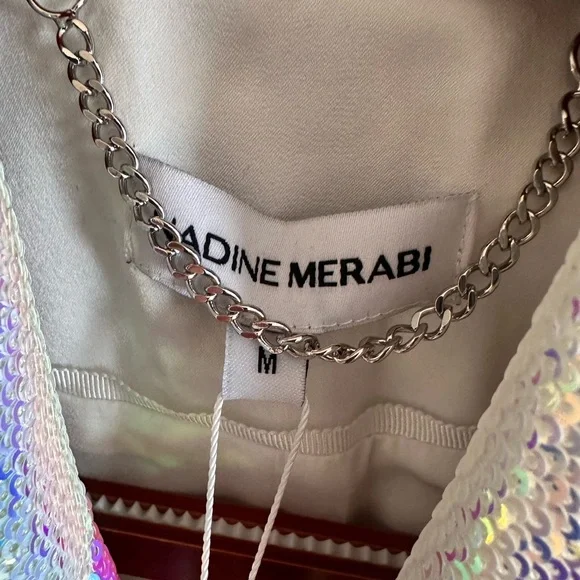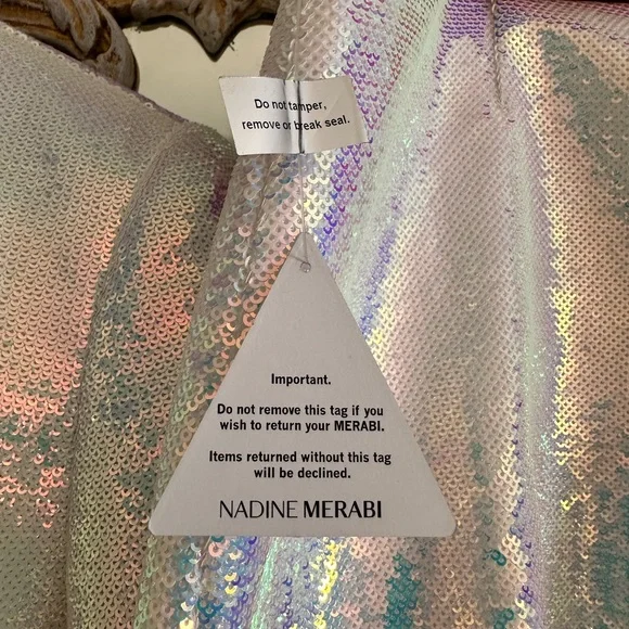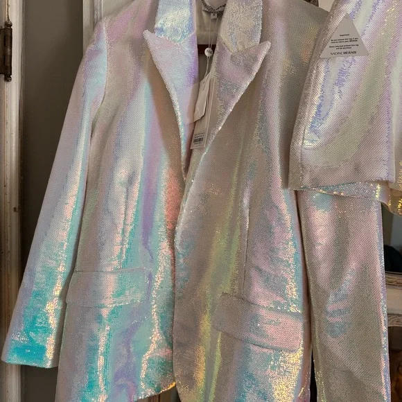 New With Tags NADINE MERABI iridescent sequins blazer and shorts set. Purchased for pageant nationals. Retail $655. NADINE MERABI size chart included. While the brand size chart and tag states size M 8, size M in this brand fits more like a size 6/8, in my opinion. Priced competitively. Serious inquiries only. I’m listing more designer pageant wear and shoes! Thank you!Priced competitively to move! Will consider reasonable offers. I need to make more room in my pageant wardrobe closet! USOA’s Mrs. Harrisburg 2025 & Mrs. Pennsylvania American 2023