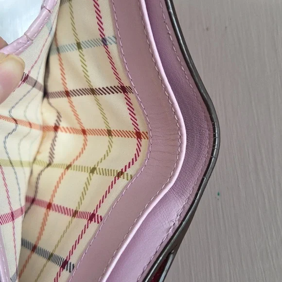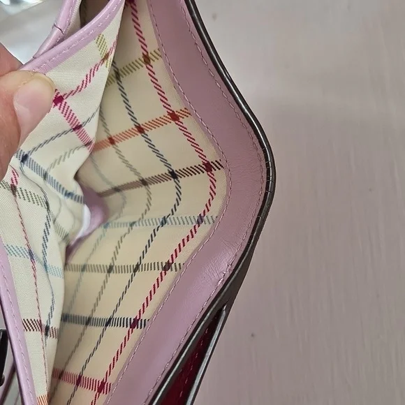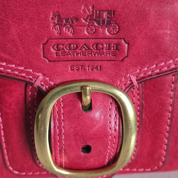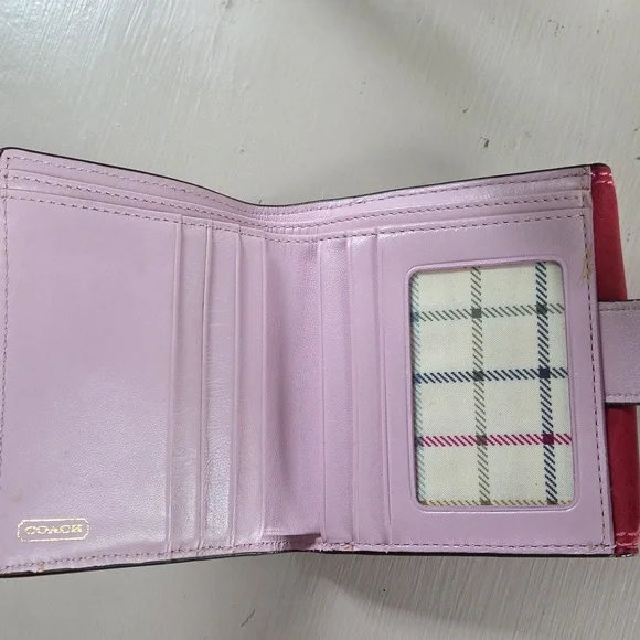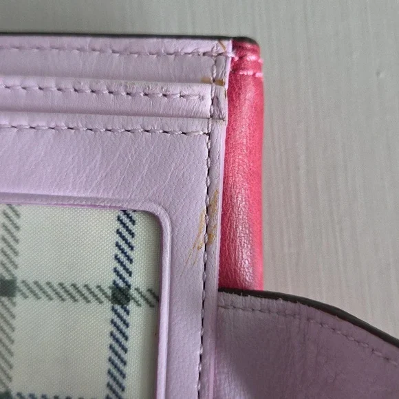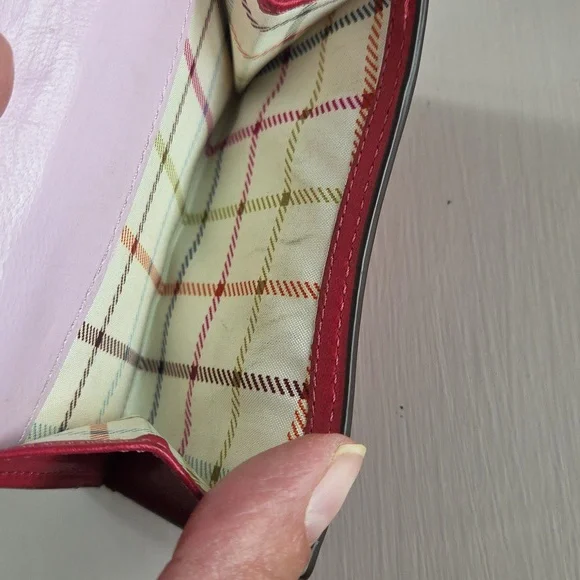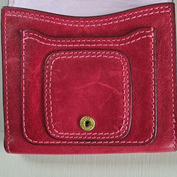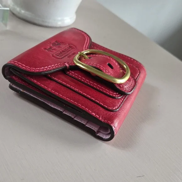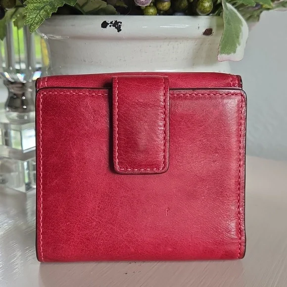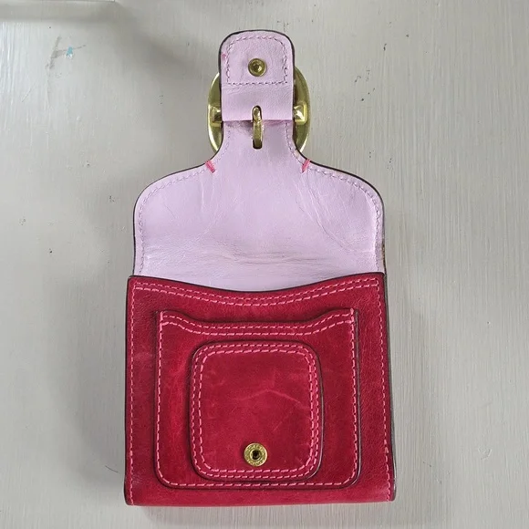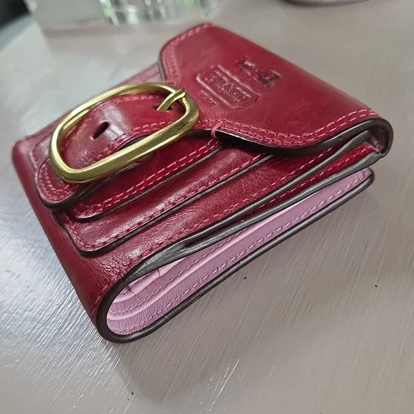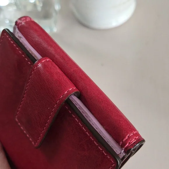 In excellent condition, this red and contrasting pink 💗 is very striking and topped with a brass buckle for some bling.*Coin purse and slip-in pocket under buckle flap*2 slip-in pockets *2 bill fold pockets *6 card slots *4"Lx4.25"H when closed;7.5"L when openedSee last 2 images for tiny marks on interior.