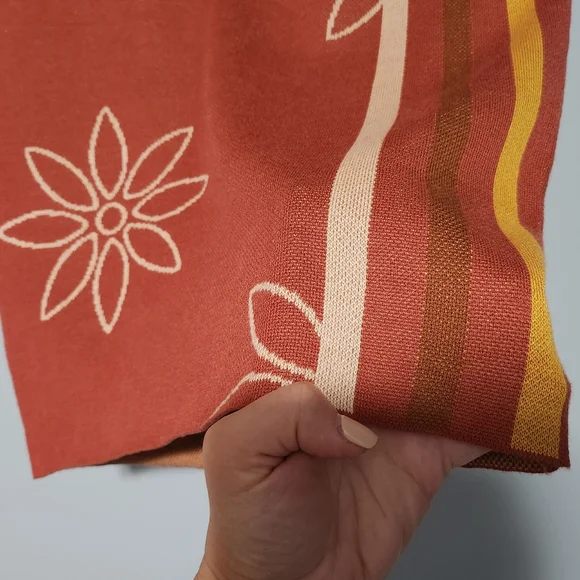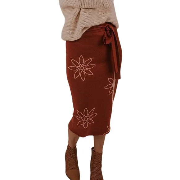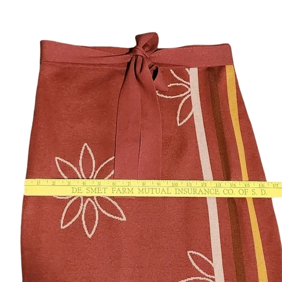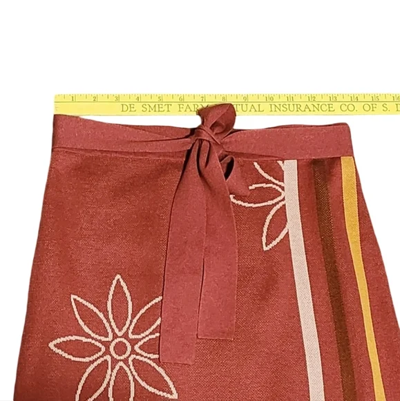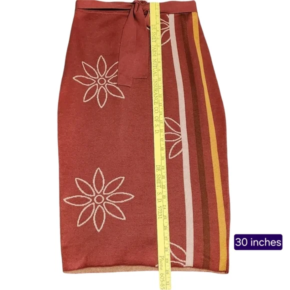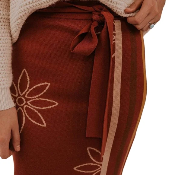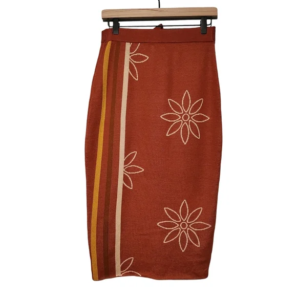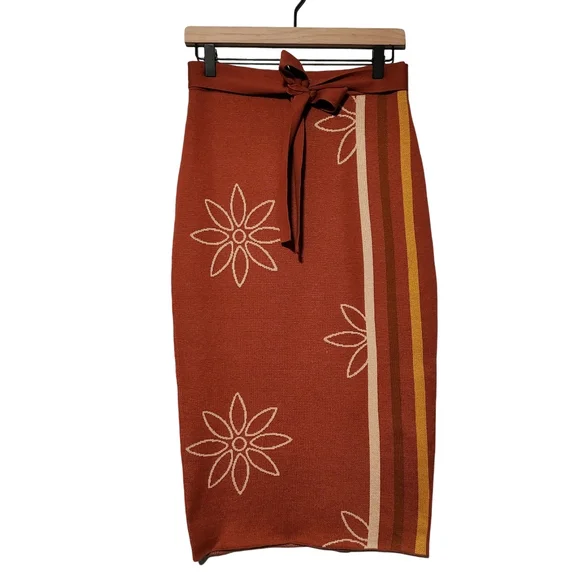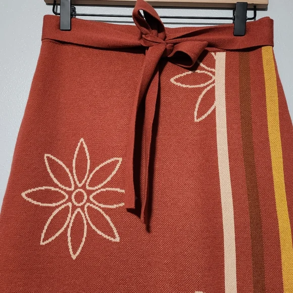 New with tag. ROOLEE rust knit skirt with floral embroidery and multi-color vertical stripes. Features a high waist with adjustable tie belt and stretch cotton-acrylic blend. Size small.Skirt is in new, excellent condition. It has been steamed and comes from a smoke-free home. Styles & Aesthetics:Cottagecore, retro, fall boho, earthy, 70s inspired, warm tones, artsy, folk, minimalist print, indie style, soft girl, librarian chicI ship fast. The same day of purchase ornext business day. Please feel free to comment with any questions. I will be happy to answer :)