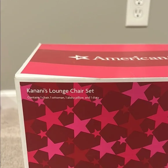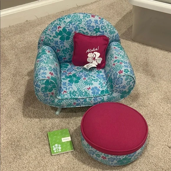 Kanani’s Lounge Chair Set. Includes all original pieces and comes with original box. Discontinued/retired set. Charming American Girl doll chair with blue floral pattern. Includes matching pink ottoman and cushion. Ideal for doll collections.