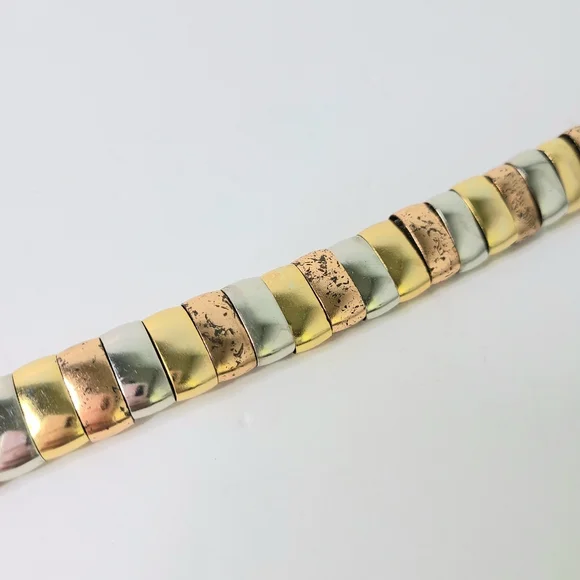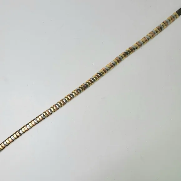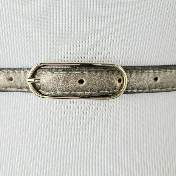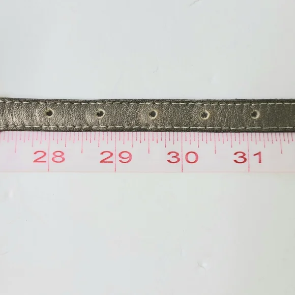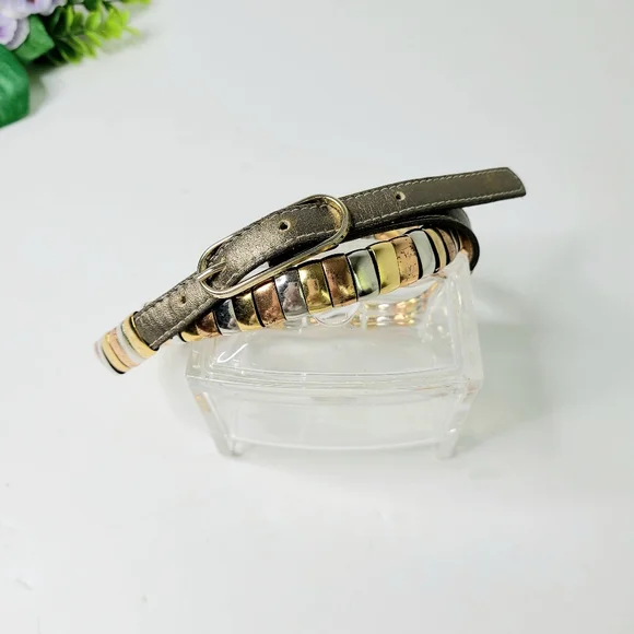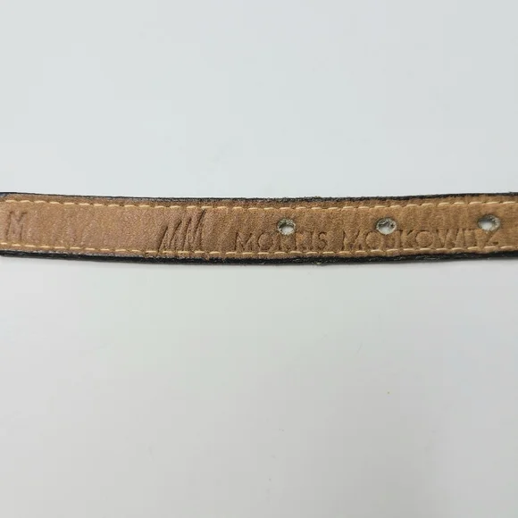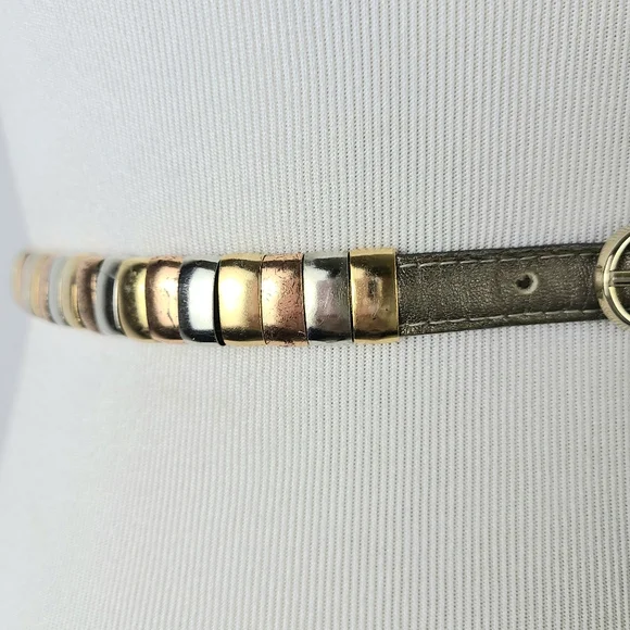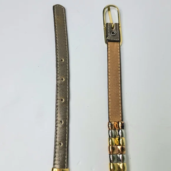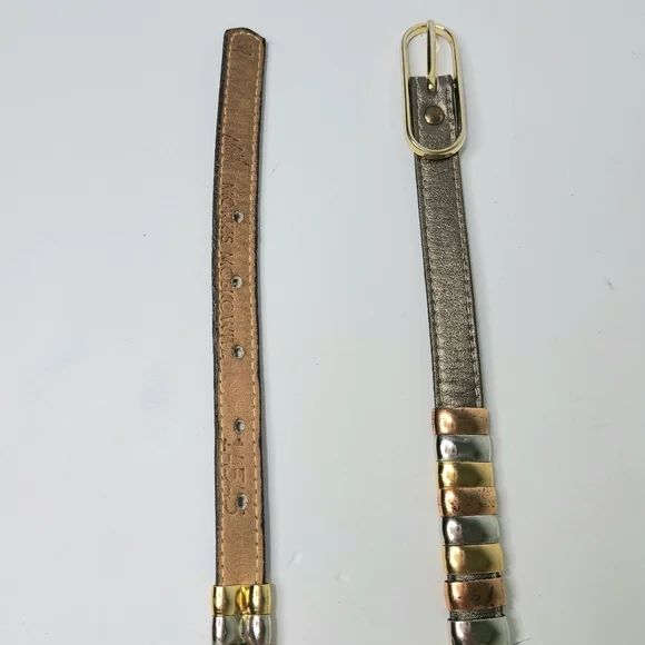 Morris Moskowitz MM Tri-Color Metal Genuine Leather Vintage Belt. Features three-color movable discs, bronze genuine leather, in a slim silhouette. 80s aesthetic. Gold tone buckle. Retro and chic. Age wear to discs, see photos. Given its age, good condition.Tags: silver, gold, bronze, rose gold, genuine leather, 80s, glam, disco, vintage, designer*Please make note of measurements, as most vintage pieces run smaller than size listed.Size: M (modern small)Length: 34"Width: 1/2"Buckle Length: 1 3/4"Buckle Height: 5/8"*Measurements are approximate Smoke-free/ pet-freeOffers are always welcome/ no trades Bundle 2 or more and save!