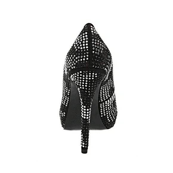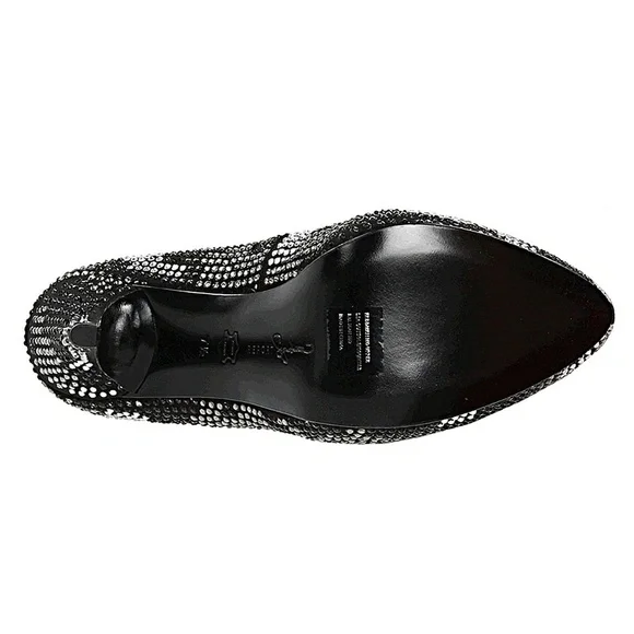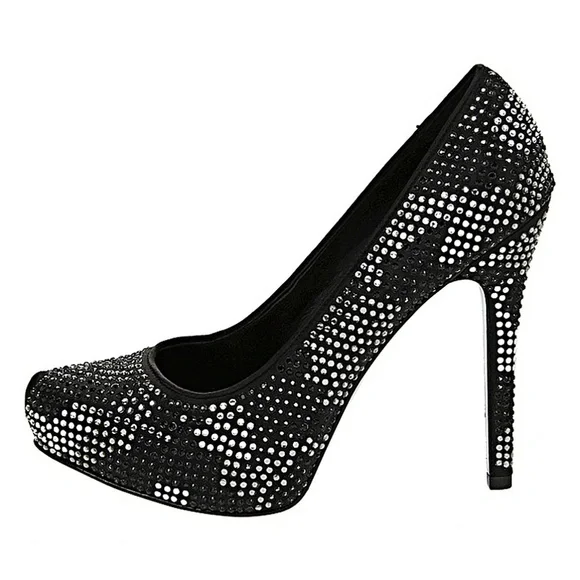 New in original boxAdd some pop to your party dress with these eye-catching pumps and make it a night to remember!Satin fabric upper.Allover crystal embellishment adds metallic glam.Lightly cushioned footbed.Smooth man-made lining.Wrapped high heel.Hidden platform.Substantial leather soleHeel Height: 4 1⁄2 inPlatform Height: 3⁄4 inWeight: 11 oz