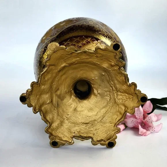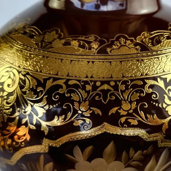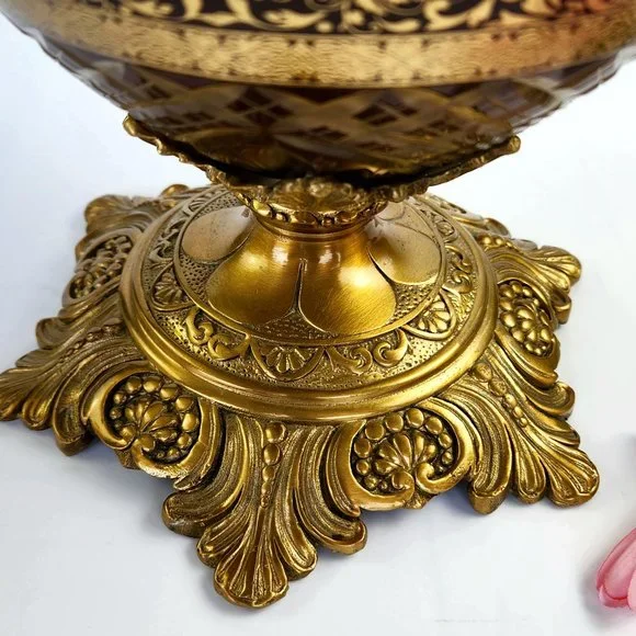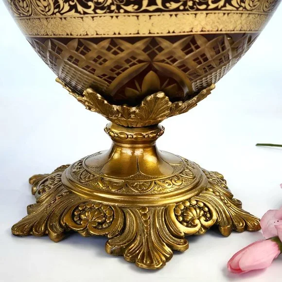 Vintage French Cut-Glass & Brass Vase - 22K Gold Etching - 14" TallThis is Pre-Owned and is in excellent condition. No Chips or Cracks.This is an immensely beautiful French Vase that looks like as if it was made yesterday. Still Fresh and New with no signs of Usage. It's made with brown color that has beautifully etched ornate design in 22K gold with cut-glass design and a brass base. Truly one of the unique vases.This is nothing like the one you may have seen over the years. It's beautiful, Unique, Royal and Elegant.A perfect addition for any home decor and a gift for someone special, specially if you love royal pieces like this.This measures approx. 14" tall, 8" across, 4 3/8" rim diameter and weighs 4.9 lb.