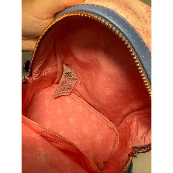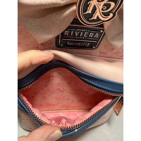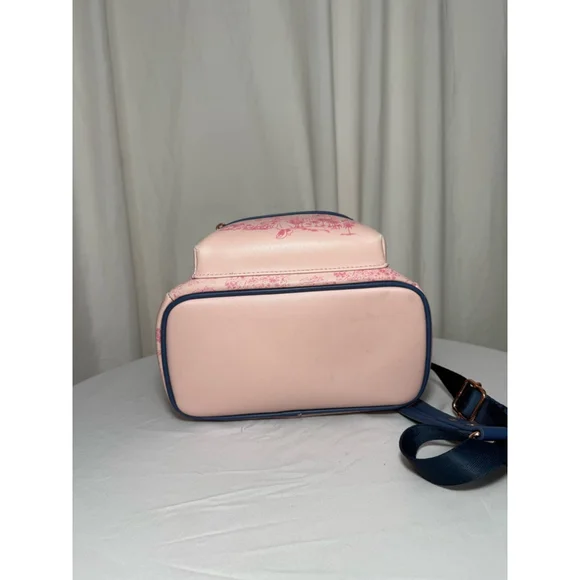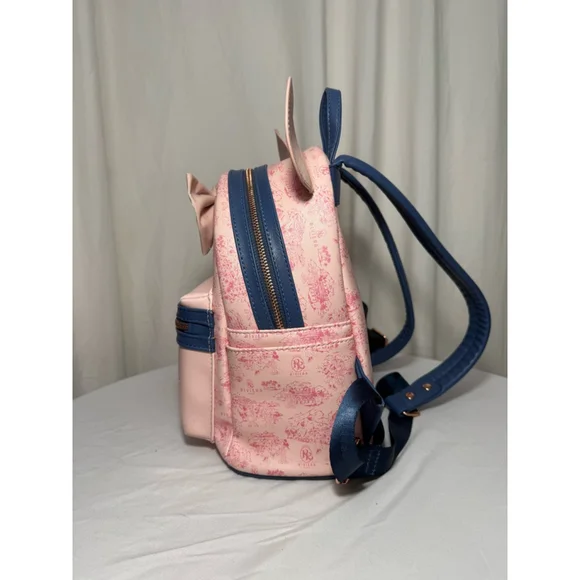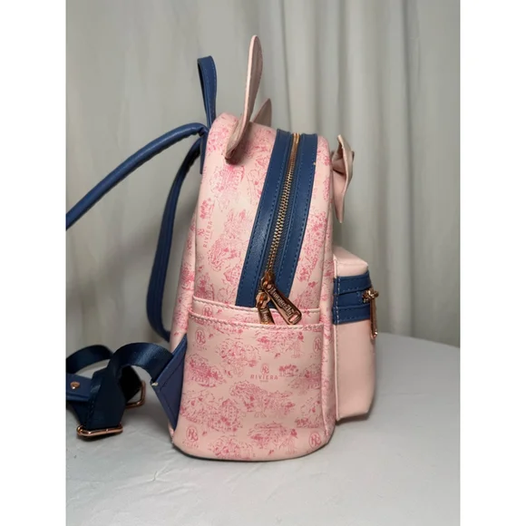 This is a pre-owned Loungefly Disney Riviera Resort mini backpack. It features a pink and blue color scheme with a Riviera Resort toile pattern. The backpack has a front pocket, side pockets, and adjustable straps. The interior lining is pink with a repeating Riviera logo. The backpack is in good condition with minor signs of wear, including a few small marks on the bow and interior.