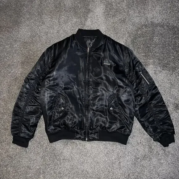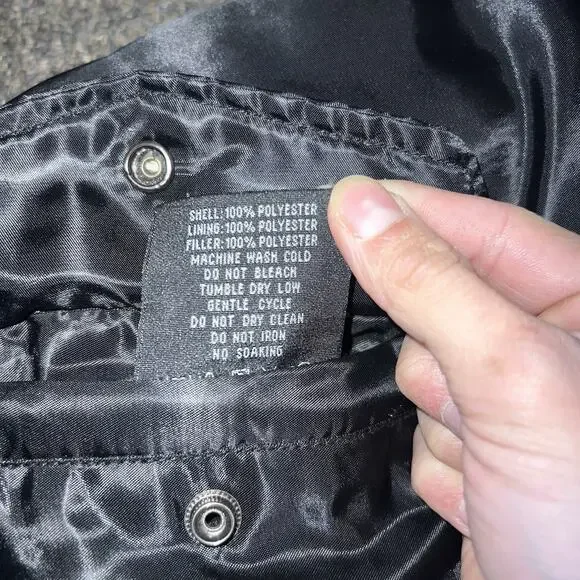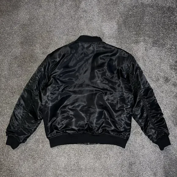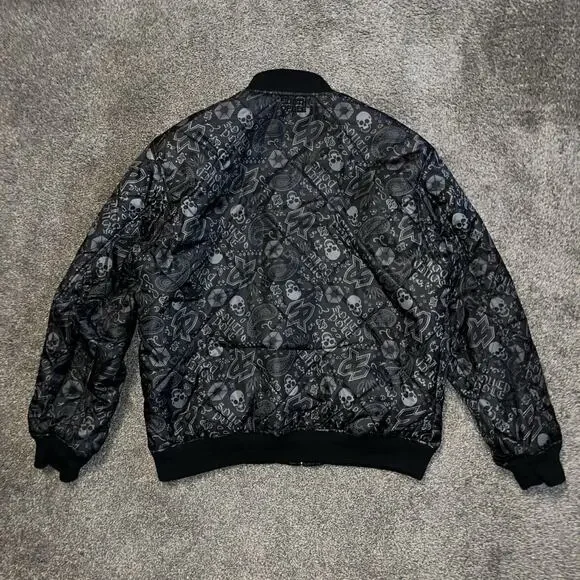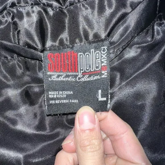 Sold as pictured, measurements are estimates. This vintage Y2K Southpole bomber jacket is a must-have for any hip hop or grunge fashion enthusiast. The black polyester outer shell features a full zip closure and softshell fabric, making it perfect for walking or skateboarding in the fall, spring, or winter. The reversible design allows for versatile styling, while the skull and paisley accents add a touch of edginess.The jacket is machine washable and has a regular fit, making it a practical addition to any casual or party/cocktail wardrobe. The Southpole brand is well-known for its quality products, and this jacket is no exception. It's a perfect statement piece for anyone looking to add some personality to their outfit.