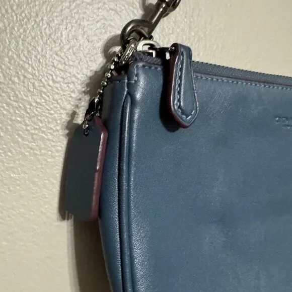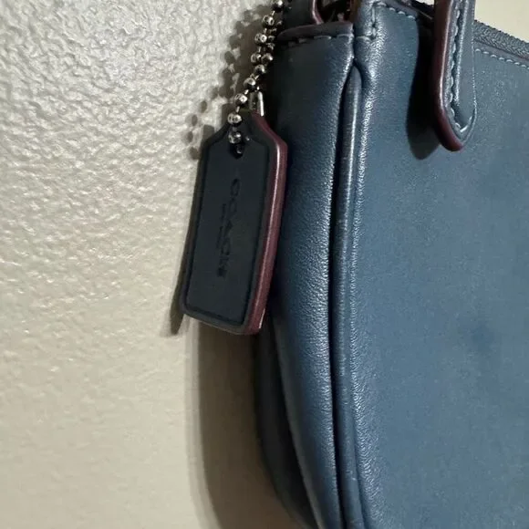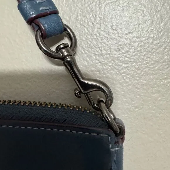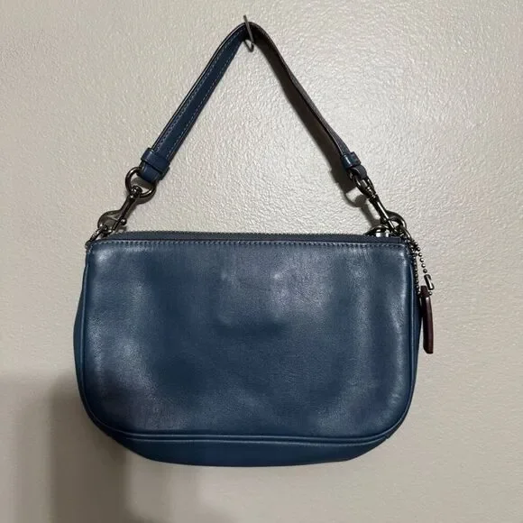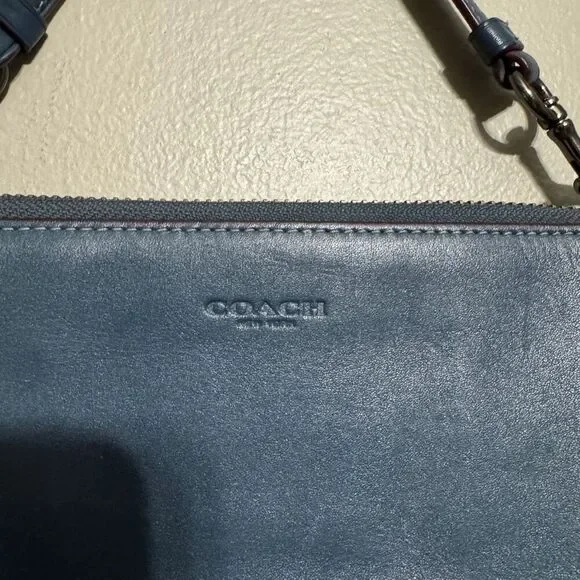 Coach Nolita Handbag Wristlet Purse in Dark Denim Blue Navy Glovetanned LeatherThis is the adorable, simple but elegant Coach Nolita in smooth glovetanned leather. It has a beautiful blue color called Dark Denim. The lining is smooth glovetanned leather as well and it features two card slots inside in a saddle brown. It has a detachable short strap which allows you to carry is a small handbag, clutch or wristlet. As the handle is completely detachable, you could also add a long strap and wear it as a small crossbody bag. It has 'Coach' on hardware and embossed in the leather and inside, you will find the Coach creed patch with the style number of the bag. It has matching Coach hangtag. Details:Color: Dark DenimMaterials: Glovetanned LeatherMeasurements: 19 x 12 x 5 cmHandle Drop: 10 cm