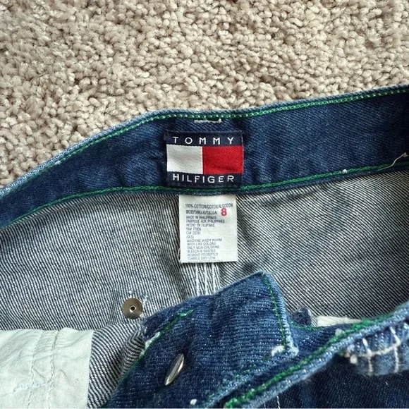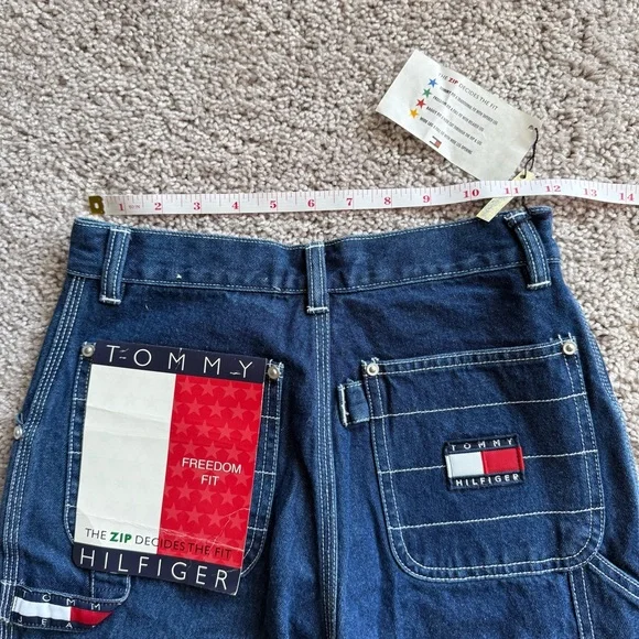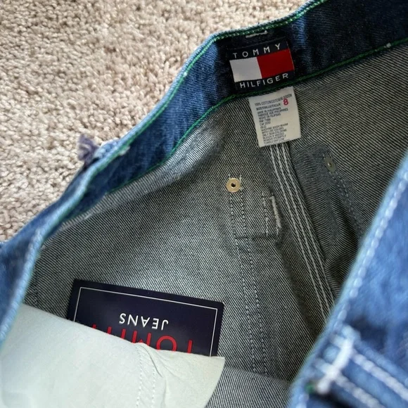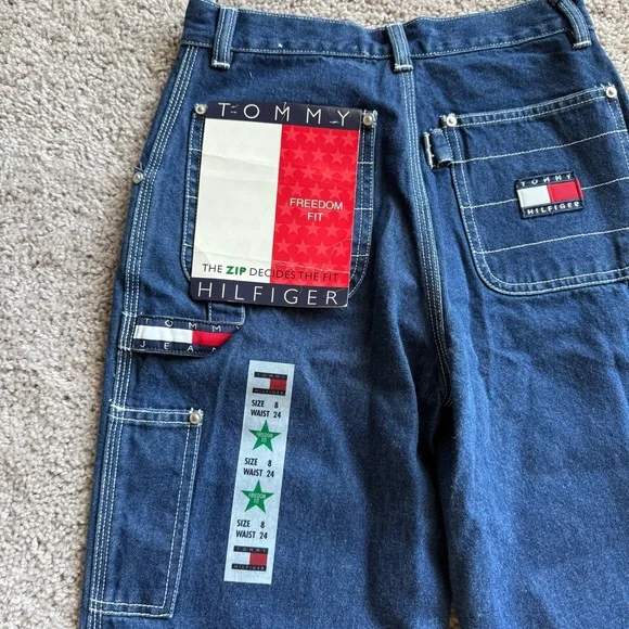 Super cool vintage Tommy jeans. Dark wash denim. Cargo style with carpenter loop and multiple Tommy patches on the back. Has belt loops. High waisted. Has all original tags. Size: 8 but is vintage sizing and waist 24 so I’d say it’s more like a modern size 4. Condition: Brand new! Has all original tags! No flaws.