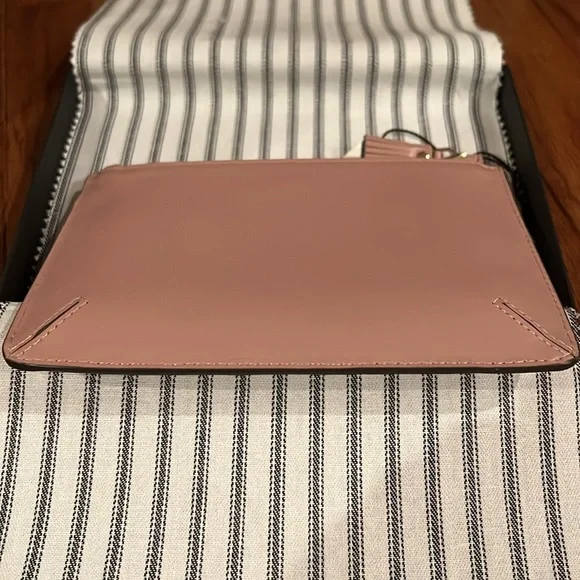 Anya Hindmarch Loose Pocket Small - Rose Pink, Burgundy leather interior.SPECIFICATION & MATERIALSDimensions: H12.5cm W17.5cm D0.2cmMaterials: Capra leather, nappa leather liningExternal details: Gold-tone zip with tassel zip-pull, Anya Hindmarch bowInternal details: Embossed Anya Hindmarch logoAll offers considered. Maintained smoke/pet free environment.