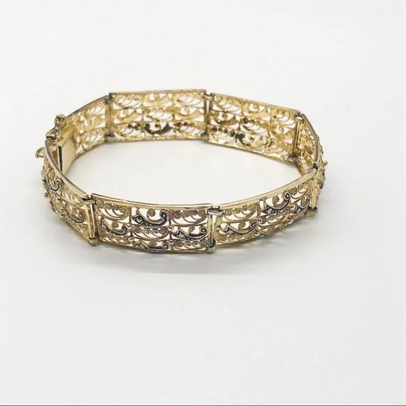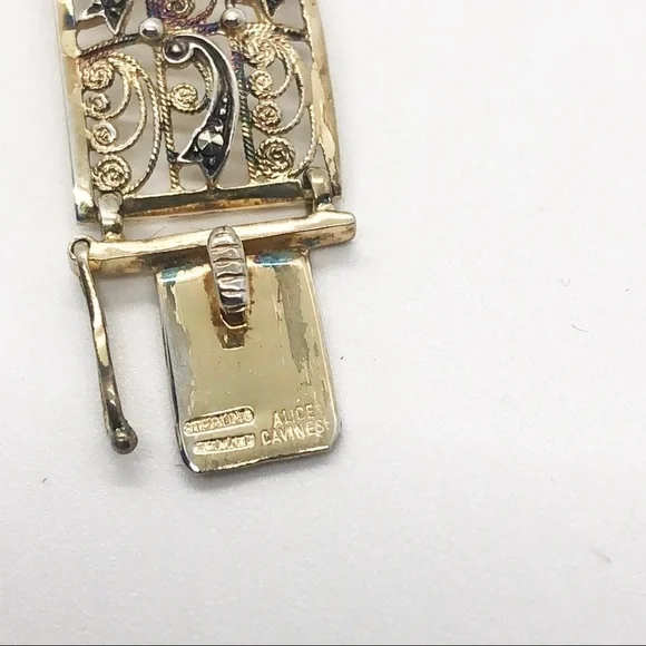 This stunning Alice Caviness bracelet is just beautiful! It is signed Alice Caviness Sterling Germany on the clasp. It measures 7 1/4 inches in length. It has beautiful a dainty goldtone filigree design with silver-colored designs with marcasite accents. All marcasite stones are intact. While it is a vermeil bracelet, it will tarnish, and this has been polished with a sunshine cloth.Seller item #BR1