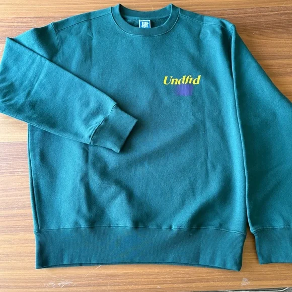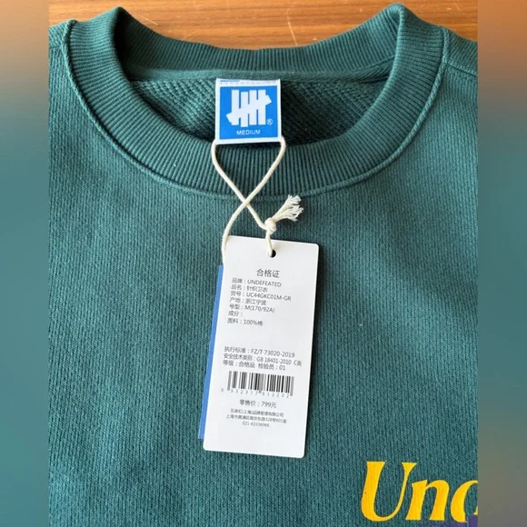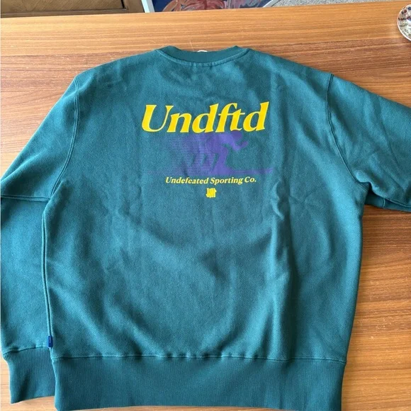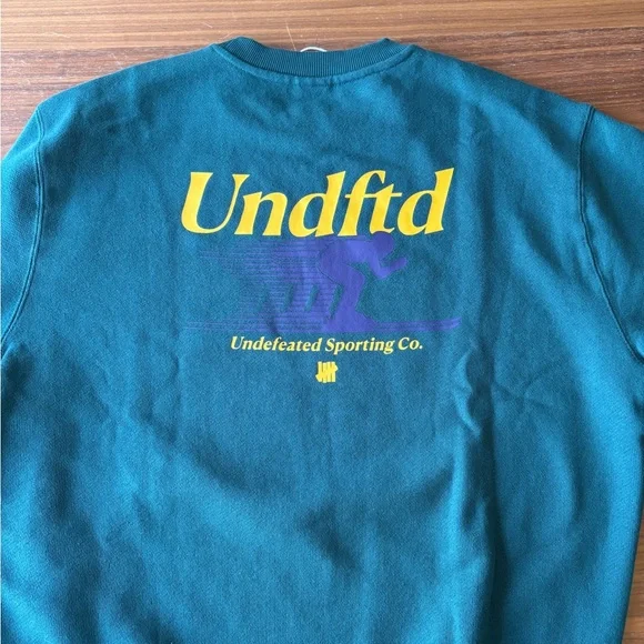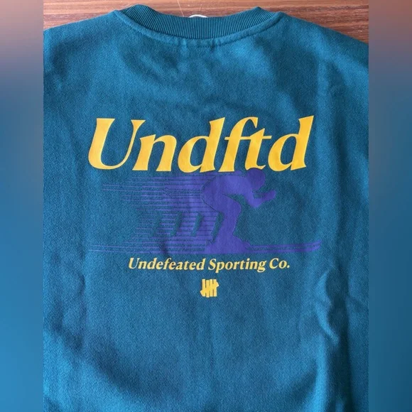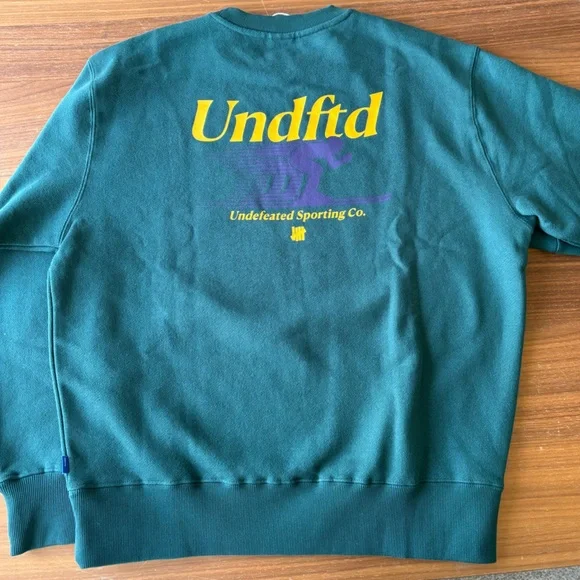 UNDEFEATED Sporting Co. Pine Green Crew Neck🔹 Purchased in Shanghai, China (Tag is in Chinese) in December 2024🔹 Store Address: 1 Hongqiao Rd, Xuhui District, Shanghai, China, 200030🔹 Brand new with tags (Includes original bag)🔹 Size: Medium (170/92A)🔹 Material: 100% Cotton🔹 Model Number: UC44GKCOIM-GR🔹 Thick & Heavyweight Design – Dark pine green crew neck with a warm, cozy feel. Features purple and yellow accents, a skier graphic on the back, and the signature UNDEFEATED tag at the bottom.My home is smoke-free and pet-free!
